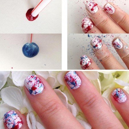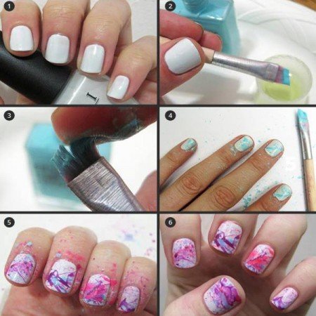 Lo primero que demos hacer es colocar una base de esmalte de uña en color blanco y dejarlo secar muy bien, luego dejamos caer gotas de varios colores sobre las uñas en blanco con una pajita que utilizamos para tomar sodas, esto lo debes hacer soplando por uno de los extremos de la pajita, y el resultado será asombroso