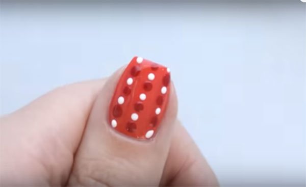 El primero de los diseños es sobre una base en color roja, toma el puntero y un esmalte en tono rojo un poco más intenso, realiza puntos formando columnas y dejando una distancia más o menos y dejando espacio entre los puntos, luego toma un puntero más pequeño y realiza puntos intercalados con un esmalte blanco, veras que lucirán muy bellos.