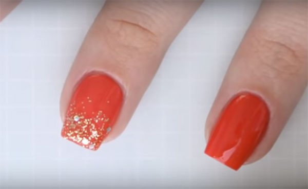 Para el tercer diseño de uñas con una base en color rojo es muy simple de realizar, lo debes hacer es tomar un esmalte con glitter dorado, he ir pincelando la punta de la uña y debes tratar de que los detalles del glitter se concentren en la punta superior, quizás requieras de más de dos capas para que luzcan espectacular.