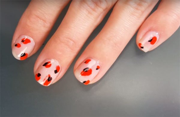 Coloca una capa de Top Coat, y aplica la base para el diseño en tono rosa pálido, agrega puntos desiguales en el tono naranja brillante y con la ayuda de un pincel fino realiza pistilos encima de los puntos naranja, espera a que seque bien y coloca una capa de Top Coat para sellar el diseño.