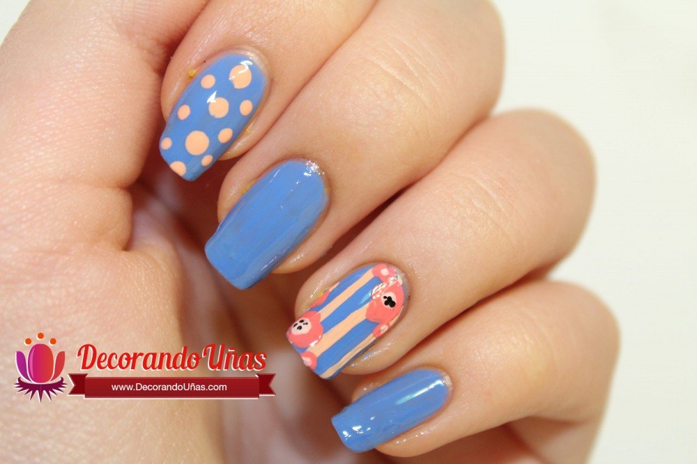 Decoración de Uñas con Puntos y Rayas con Base Azul: si realizamos el fondo en tono azul cielo o turquesa, veras una perspectiva apropiada para realizar una gran combinación de diseños. Lo cual pueden ser de líneas blancas y puntos en tono naranja. Sin duda que las rayas en tono azul y los puntos en tono blanco, son una forma muy linda de realizar esta decoración.