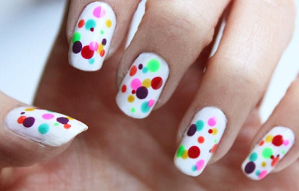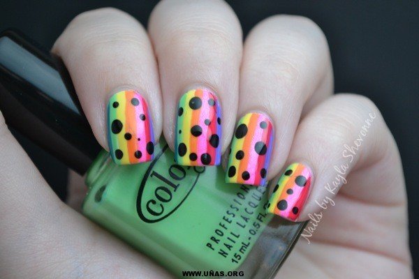 Decoración de Uñas con Puntos y Rayas de Colores: evidentemente aquí lo mejor es procurar hacer una combinación, realiza un fondo en tono blanco y que las líneas sean de colores simulando un arco iris y así conseguirás una excelente combinación, otra opción podría ser líneas blancas con un fondo en color negro y punto de muchos colores