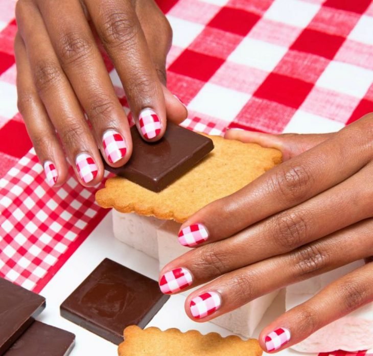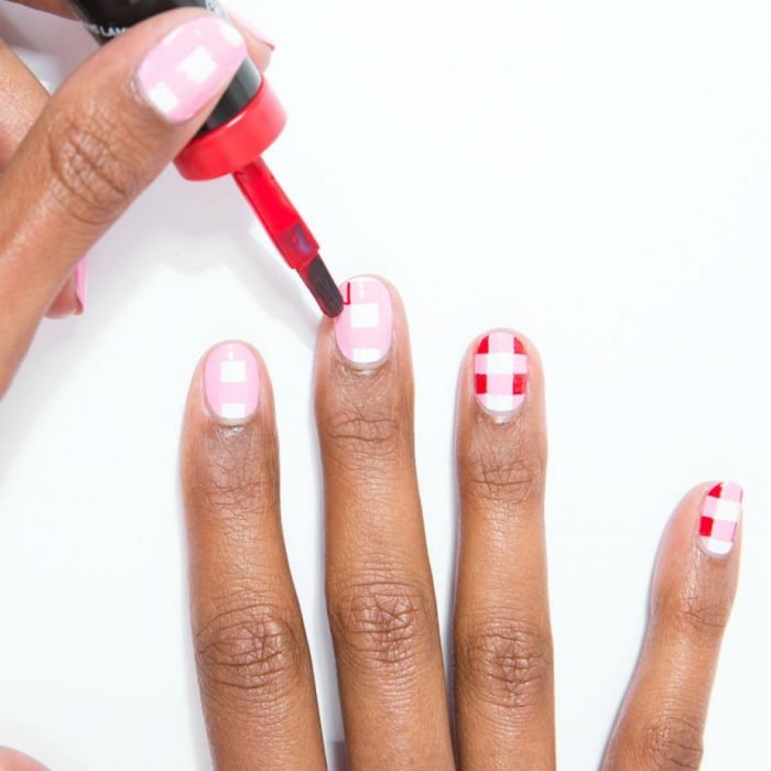 Pinta primero toda la uña de color blanco, después dos líneas verticales color rosa, y sobre ellas otras dos líneas rosas de un grueso más o menos igual. Una vez así, te quedarán solo dos cuadros blancos; sobre ellos, guíate para pintar los pequeños cuadros por donde se cruzaron las primeras líneas rosas. Es mucho más sencillo de lo que parece si usas pinceles planos, pues te ayudarán a crear esquinas en tus cuadros mucho más derechas.