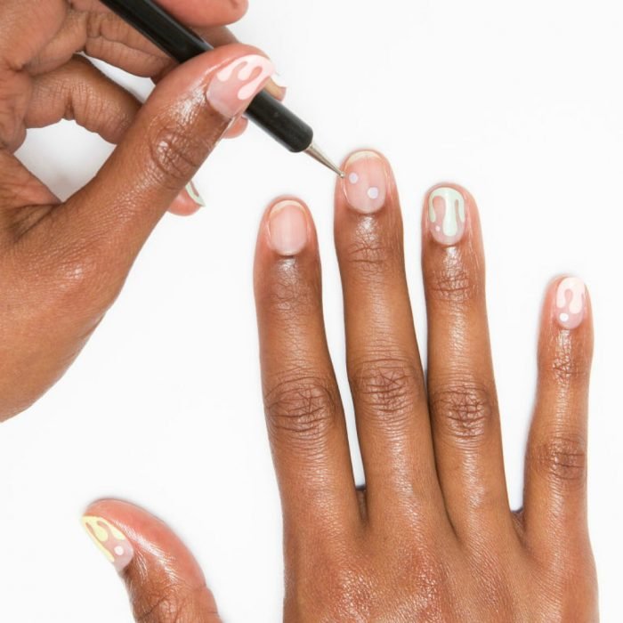 Usa un pasador (o alguna herramienta con punta redonda) y con esmaltes de colores pastel comenzarás pequeños puntos, para después unirlos entre sí y lograr ese efecto de gotas derritiéndose sobre tus uñas.