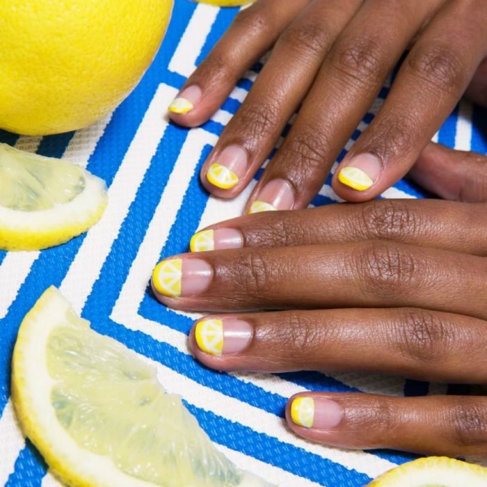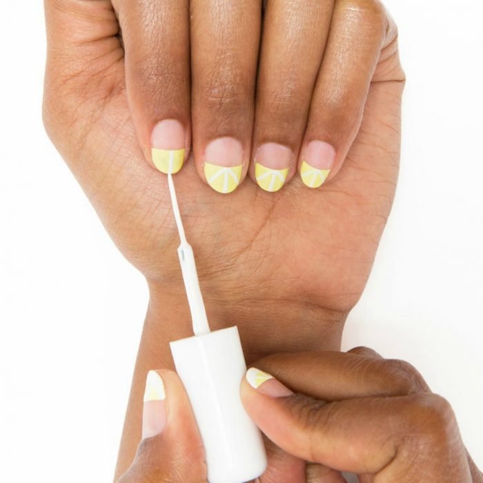 El diseño más sencillo y lindo de todos: lima tus uñas hasta que queden totalmente circulares, sobre esa curva pintarás un medio círculo del esmalte amarillo que más te guste. Después con un pincel más delgado pinta con blanco una línea vertical que divida el medio círculo, y dos líneas que dividan las partes como si fueran rebanadas de pastel. Finalmente crea una media luna para darle volumen a tus lindos gajos de lima.