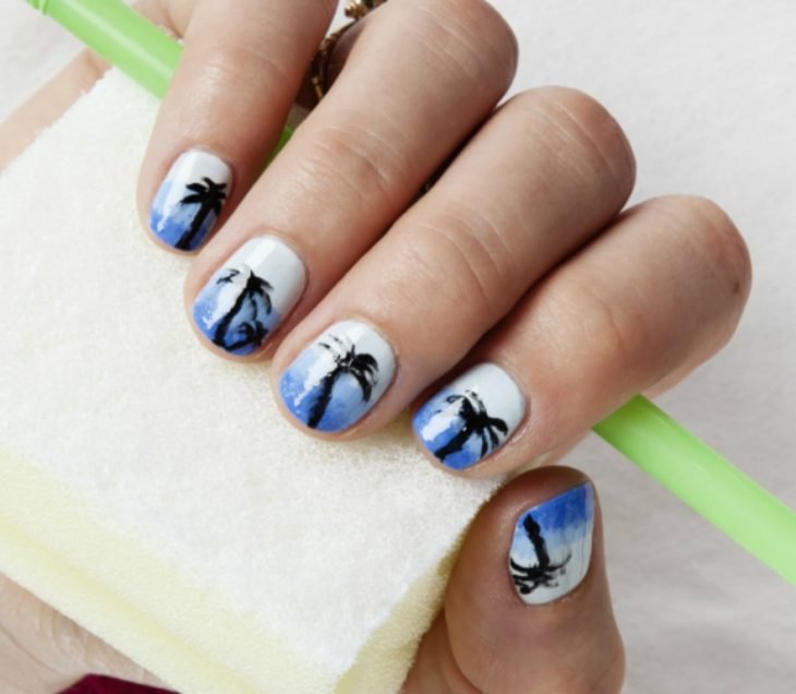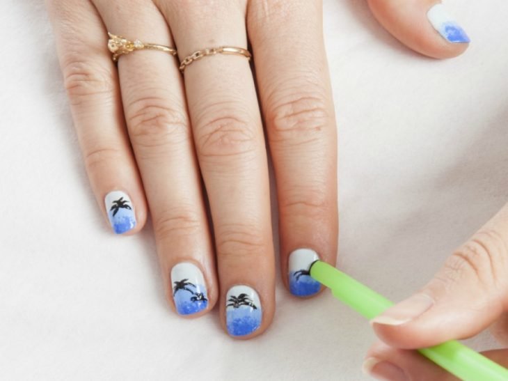Después de pintar el fondo más claro de tu diseño, con una esponja pintarás suavemente con azul cielo y más abajo con un tono de azul más fuerte. Una vez terminado recortarás la mitad de una pajilla o popote y con ella podrás crear curvas para las copas tus palmeras. Finalmente agrega los detalles del tronco con un pincel más delgado.