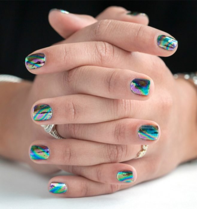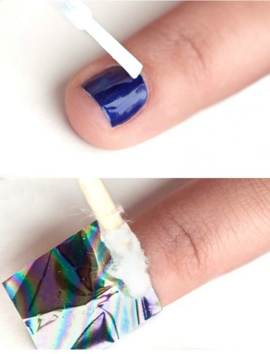 Primero pinta tus uñas de un color más oscuro, o de preferencia azul galáctico; después con una ligera capa de pegamento blanco o transparente, rápidamente y antes de que seque, pega un pedazo de papel metálico sobre la uña y presiona con fuerza durante medio minuto. Después retira el papel y verás cómo el brillante holograma se queda pegado en tus uñas.
