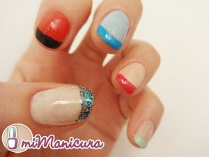 Cada ejemplo de manicura lo hemos hecho en un dedo diferente de la mano. Así el resultado final ha sido este, una manicura original, completa y divertida a la vez.