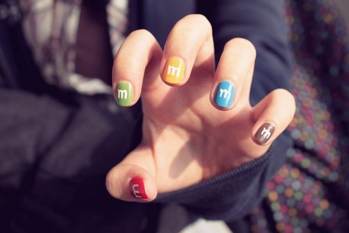 Un diseño original, bastante divertido, dulce y fácil de hacer, además de que no se necesita tener las uñas largas para que se vea bien el diseño. Se necesitan los colores de las lunetas y un pulso más o menos bueno para crear la M en cada uña.