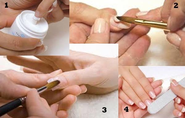 Este es un proceso muy simple pero el cual necesita de mucha practica para su realización. Estos son los 4 pasos básicos para los principiantes en este tema, el cual les facilitara colocar unas acrílicas en sus uñas naturales en la comodidad de su hogar.