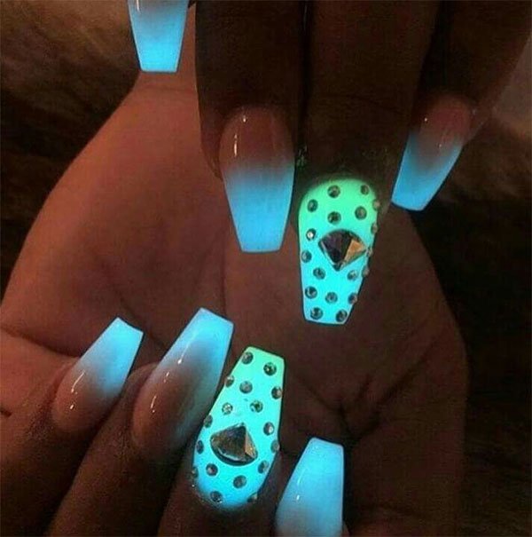 • Es posible que veas un poco de resplandor casi inmediatamente, pero lo podrás notar intensamente en la oscuridad o a la luz de la disco. Tienes que tomar en cuenta que el esmalte puede tardar un poco más en secarse, por este motivo debes aplicar capas muy finas de esmalte.