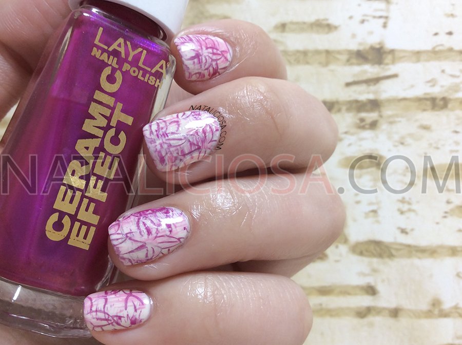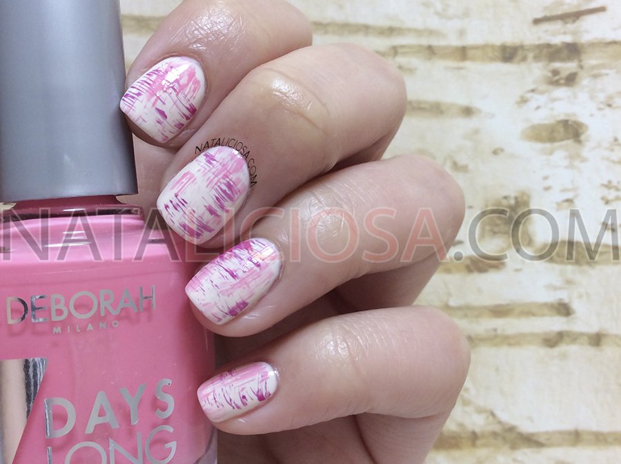 Llevo el tono 822 de Deborah Milano (de la colección 7 Days Long, lo veis en la siguiente imagen) en forma de brochazos claros. Los oscuros son del esmalte NL21 de los Ceramic Effect de Layla.