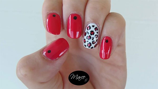 Ahora debes aplicar un punto negro en el centro de las uñas hacia la cutícula en las que tienen esmalte en tonos fucsias y luego debes pasar a trabajar en las uñas de base blanca. Debes añadir puntos de color rojo con ayuda de un puntero y delinea sobre ellos los bordes en dos secciones con ayuda del esmalte negro para similar la piel de un leopardo, y al terminar deja que seque y cubre con un esmalte top coat.