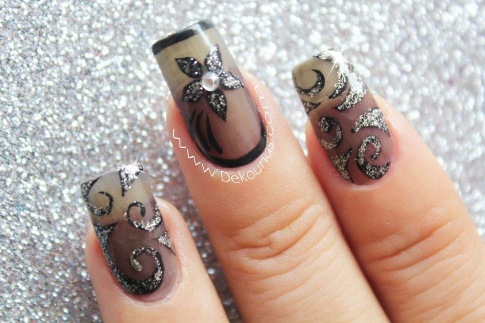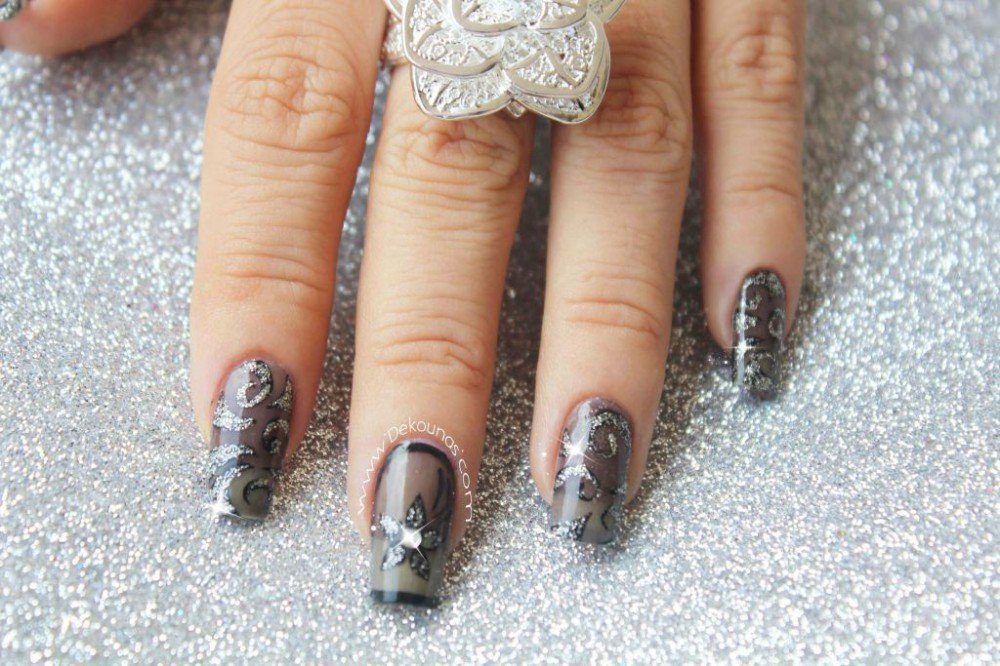 Hoy quiero enseñarles la técnica del ahumado, me encanta porque el resultado es muy elegante. Yo utilisé un brillo que revolví con unas cuantas gotas de esmalte negro para así crear mi esmalte efecto ahumado. Después realicé el diseño de flores y arabescos con pintura nail art negra y un pincel de detalle. Al final apliqué el top coat y coloqué una piedra plata en el centro de la flor.