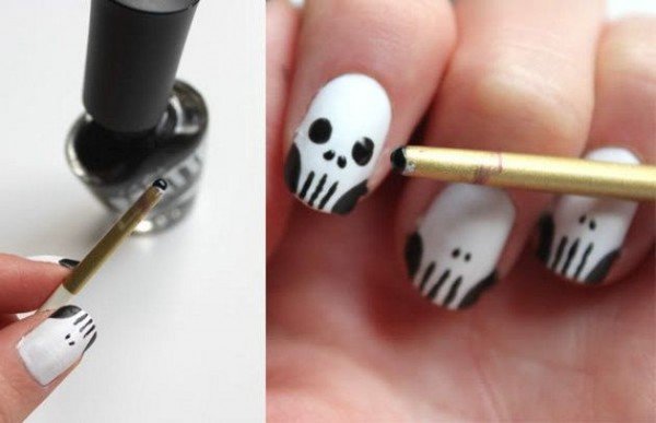Ahora moja el extremo del mango del pincel en esmalte negro. Presiona con cuidado para crear los ojos de la calavera.