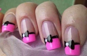 Para hacer este decorado, hazte primero la manicura francesa como es habitual pero usando el color rosa en vez de blanco. Después con un esmalte negro de brocha fina traza el lazo. Y por último, pinta un puntito blanco en el centro del lazo. Aplicando una capa de esmalte transparente conseguirás darle un toque acabado en brillo a tu diseño.