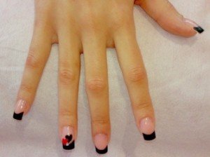 Se trata de hacer la manicura francesa habitual pero usando el esmalte negro en vez del blanco para la punta de la uña. También se han dibujado algunos corazones en las uñas de la imagen, lo cual nos encanta para ponerle un pequeño adorno a la uña.