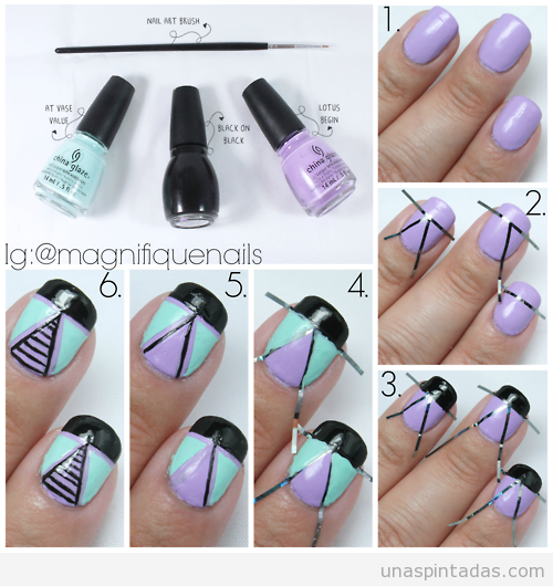 Para hacer este diseño de uñas necesitáis unas tiras muy finas de cinta adhesiva – o celo o schotch- y, en según qué tiendas, podéis encontrar unos rollos que son especiales para Nail Art). Sigue el tutorial de @magnifiquenails para aprender a hacer esta decoración de uñas con estampado geométrico, basada en triángulos. Según mi punto de vista, omitiría el punto 6 y no dibujaría las líneas horizontales, pero va a gustos la cosa.