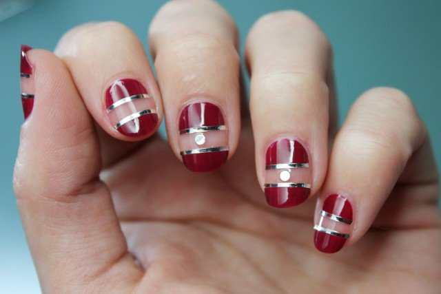 Primero cortaremos la cinta adhesiva en tiras finas y pegaremos los trozos horizontalmente en la mitad de las uñas aproximadamente. Después pasaremos a pintar las uñas con un rojo burdeos muy cubriente para luego retirar la cinta. No es necesario que lo dejéis secar antes.