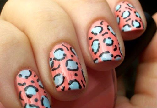 El primer diseño te muestra lo que nunca falta en ningún color, la piel de leopardo. En la mezcla con celeste se vuelve un diseño veranero, de playa, del Caribe. Puedes leer aquí como hacer la piel de leopardo si aún no lo has practicado, es muy fácil. Piel de Leopardo.