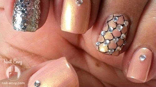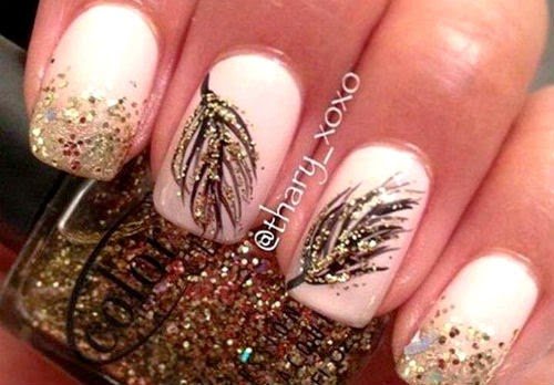 El diseño anterior es hermoso y no es difícil, puedes dibujar las plumas y con un pincel fino se pone el esmalte con escarcha. El siguiente diseño tampoco es difícil, la uña más decorada se puede hacer con un marcador de uñas u otro tipo de marcador (yo uso Sharpie), primero pintas toda la uña del color deseado, esperas a que seque y luego ayudándote de una regla si lo necesitas dibujas las líneas (con el marcador), una vez la pintura este seca pones las piedritas y luego protector.