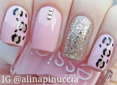 Este diseño es un poco más complicado pero solo se necesita de pinzas para poner las piedritas brillantes y un par de palillos para crear las decoraciones de piel animal y tres colores de esmalte.