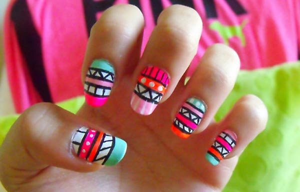 Si bien el blanco y negro son colores que soportan éste tipo de uñas, igualmente los colores se reúnen para crear bellos escenarios estéticos. Las lineas y rayas son parte de la cultura, ya que son sencillas de hacer en casa y por tanto están alejadas de lo puramente comercial.