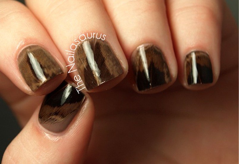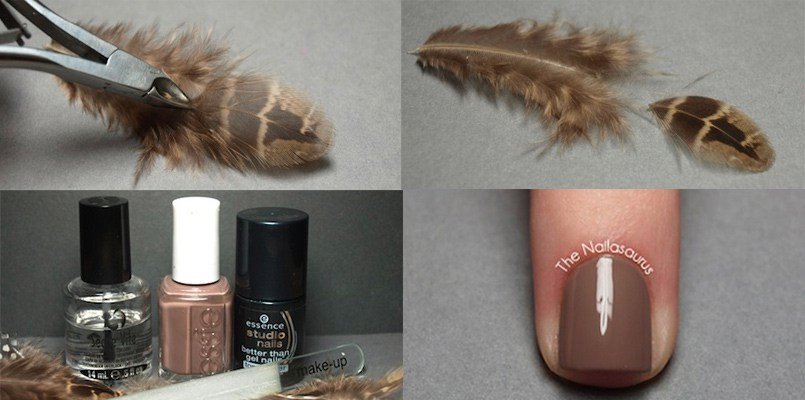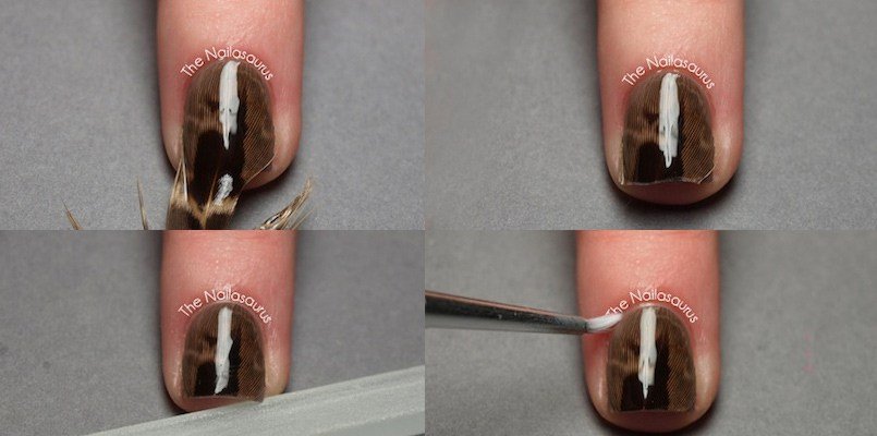 Antes de empezar, prepara todas las plumas y corta sus extremos con la ayuda de unas tijeras. Escoge aquellas plumas que más coincidan con el tamaño de tus uñas para que así no sobre salga demasiado en las cutículas.