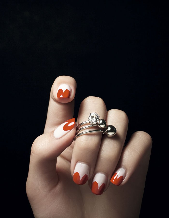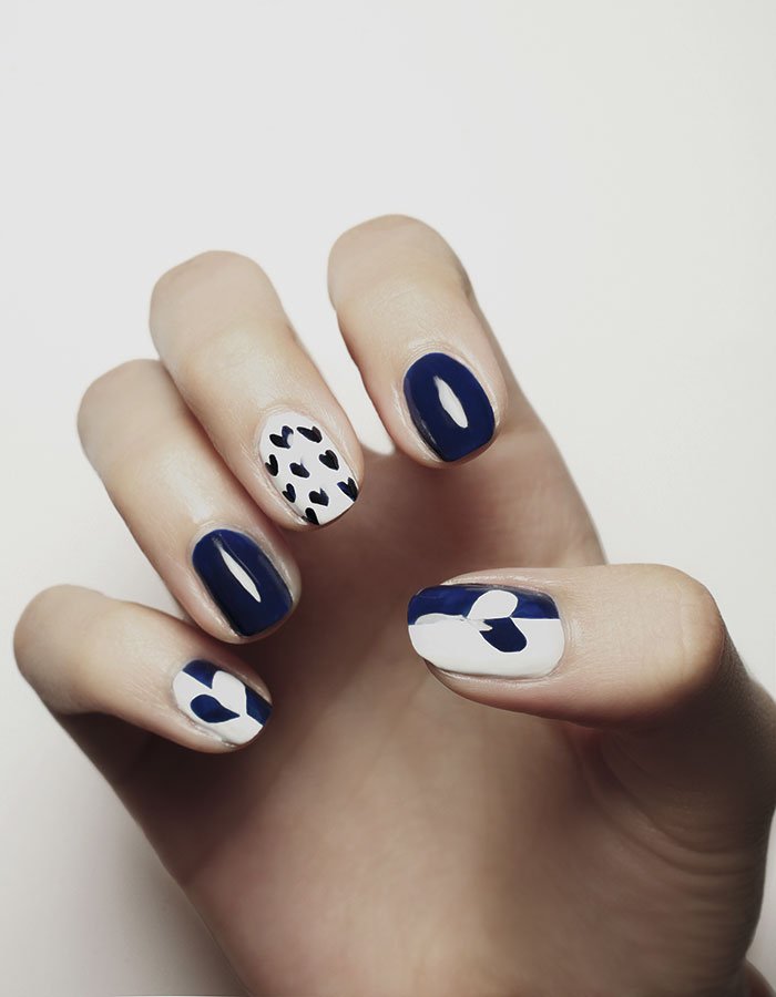 6) Para la uña del dedo mayor, sobre una base blanca y una vez que estuviera seca, con un pincel de manicure se dibujaron pequeñas ‘v’ para formar los corazones.