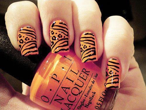 Uñas de Animal Print de Leopardo. Lo clásico nunca pasa de moda y por eso es que el leopardo es de los favoritos de todas las mujeres. Con una combinación de naranja y líneas negras, es como podrás hacer que tus uñas parezcan que tienen la piel de un animal salvaje y hermoso como el leopardo.