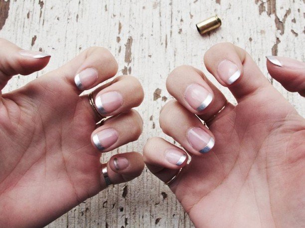 El procedimiento consiste en que debes asegurarte de que no te queda restos de esmalte en las uñas, luego, te aplicas base de uñas para protegerlas. De esta forma, van a lucir mejor que nunca y te vas a ver divina; después agarras el esmalte plateado y te das dos capas en las uñas de modo que queden muy tupidas, cerciórate de dejarlas secar bien, ahora toma las pegatinas de uñas para la manicura francesa, aplicas una en cada uña de manera correcta y pintas lo que sobre en glitter gris. Lo dejas secar bien y para terminar le aplicas top coat.