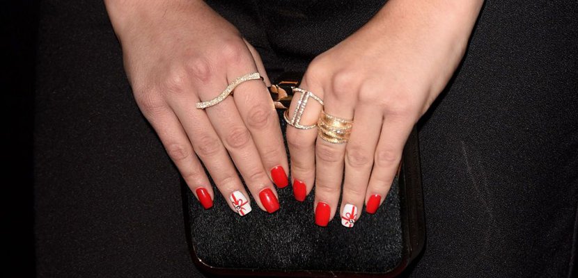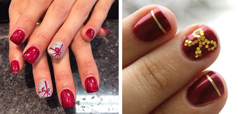 En este caso vemos unas uñas que se inspiran en los regalos navideños. No falta el mítico color rojo de la Navidad, y algún que otro toque dorado o plateado. Estos toques de nail art pueden ser muy divertidos para darle vida a tus uñas durante estas fiestas. Puedes utilizar pegatinas que se ponen directamente sobre las uñas, para dar un top coat transparente por encima, o bien pintarlas tú si tienes el suficiente pulso. ¿Qué te apetece más? Eso sí, hazlo solamente en una o dos uñas, o el efecto puede ser excesivo.