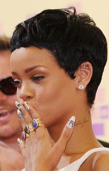 Puestos a elegir el diseño de sus uñas, la cantante Rihanna es de las más originales. Dibujos en blanco y negro, muy elaborados en los que incluso aparece la Reina Isabel II de Inglaterra. Ella quiso aparecer majestuosa en la gala de los MTV y los consiguió, pues sus manos no pasaron desapercibidos a los ojos de los curiosos.