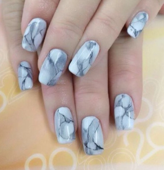 Por suerte, esta tendencia no implica llevar pesadas piedras sobre tus uñas, sino solo simularlo. Elige el color que más te guste y cubre la uña con un par de capas. A continuación, con un tono negro o gris (o de cualquier otro color que combine con el de fondo) empieza a dibujar las aguas o vetas que haría este material si fuera real y difumina ligeramente con una esponjita. Repite el proceso hasta que te guste el resultado. A medida que vayas practicando te irán quedando mucho más realistas.