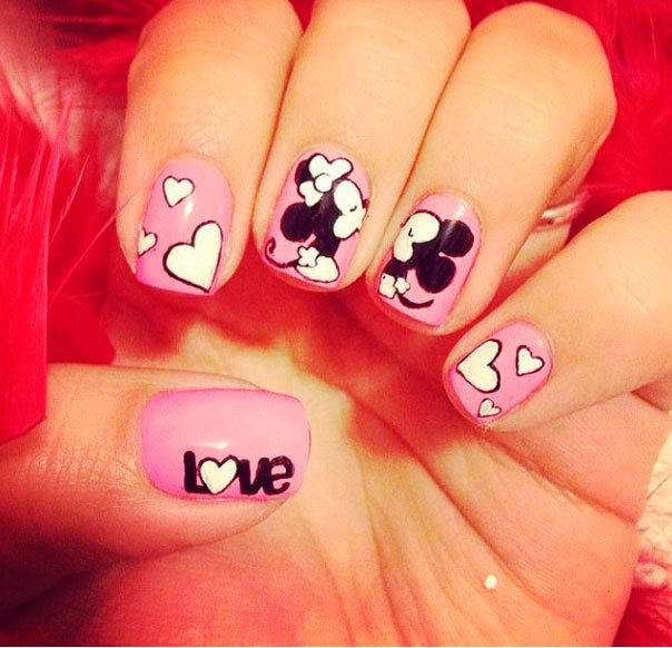 Si quieres lucir un nail art más fácil de hacer puedes apostar por un diseño de Mickey and Minnie Mouse. Necesitas varios esmaltes: en negro, blanco y rosa. Primero aplica una capa de esmalte rosa y a continuación, con un pincel de nail art, dibuja los motivos Disney que ves en la foto con los esmaltes correspondientes. Por último aplica un top coat.