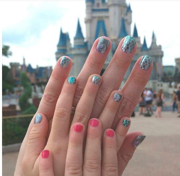 Si quieres lucir un nail art Disney no muy llamativo, opta por un diseño inspirado en la película la Sirenita. Utiliza esmaltes con acabado metalizado en tonos verdes y azules. Realiza unas escamas con un pincel (de nail art) en color plata. El resultado es bonito y perfecto para el verano.