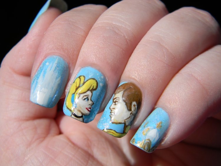 Si te gustan los nail art con mucha fantasía, te encantará este diseño con glitter. Realiza este nail art con esmaltes en azul y blanco. Encima aplica purpurina plateada en polvo (la debes sellar con un top coat). En una de las uñas dibuja una silueta de la Cenicienta en un nail art blanco (para que sea más fácil puedes realizar este paso con una plantilla). Por último, en otra de las uñas aplica strass y joyas. Sin duda alguna, conseguirás un nail art de auténtica princesa de Disney.