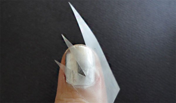 - Ahora tomamos la cinta ya cortada y la pegamos con mucho cuidado sobre el esmalte base ya completamente seca, trata de que esta quede muy bien pegada para que al momento de retirarla el esmalte de arriba no se llegue a correr.