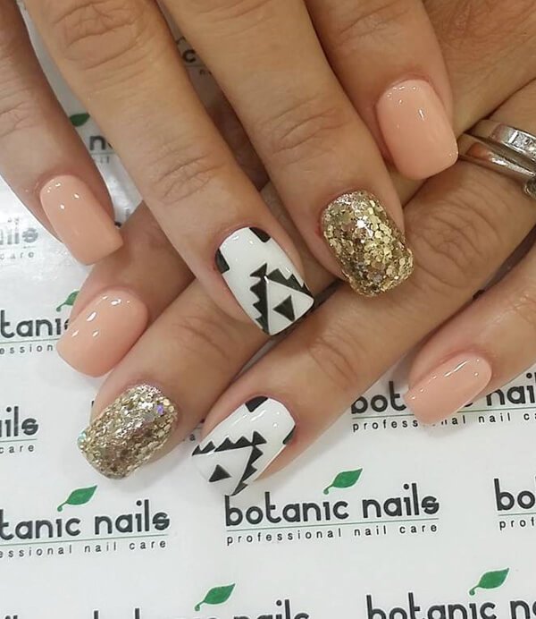 Al combinar estampados con diseños solidos estamos agregando un contraste muy inspirador es una forma de hacer presente o de dar un marco para apreciar mejor los detalles, El negro y el dorado es una versión muy tradicional, apliquémoslo en uñas francesas, es hermoso ver que cuando a veces nos salimos de los parámetros trae resultados fantásticos; de igual forma puedes agregar toques de figuras geométricas oscuras sobre un color solido quedando aún más bello.