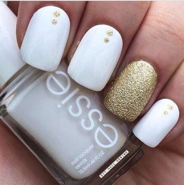 Fantástica y glamurosa idea para realizar una manicura con esmalte blanco y brillos dorados.
