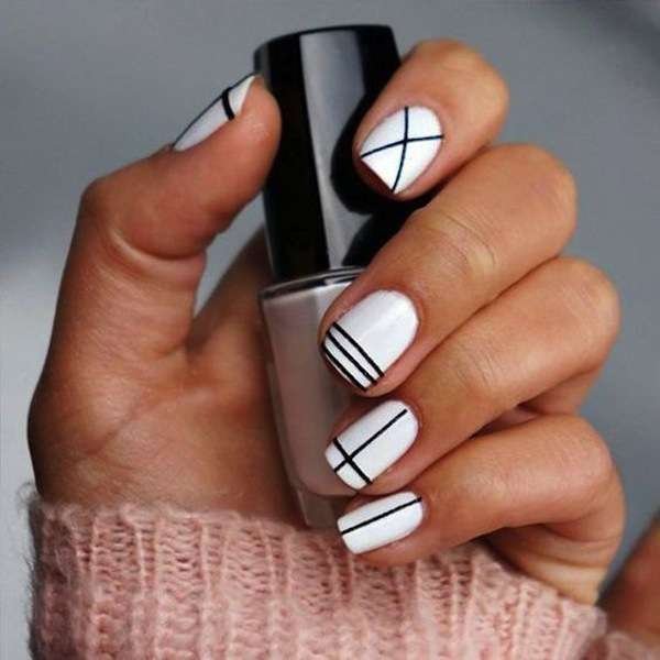 Pintar nuestras uñas de blanco y jugar con líneas de color negro causará un efecto divertido en nuestras manos.