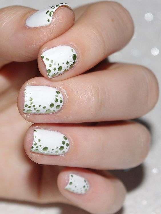 Fantástica idea de esmalte blanco con lunares verdes de diferente tamaño.