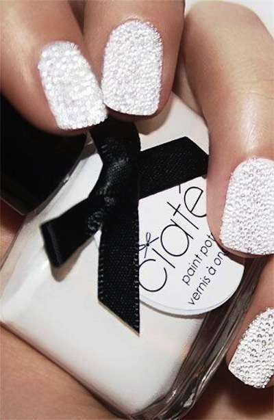 Idea glamurosa para utilizar el esmalte blanco e incorporar un efecto de caviar transparente que dará mucho brillo.