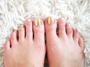 Otra decoración de uñas de los pies conservadora y moderna. Los tonos dorados son ideales para el día, ya que con la luz solar se ven tornasolados y además combinan con todo.