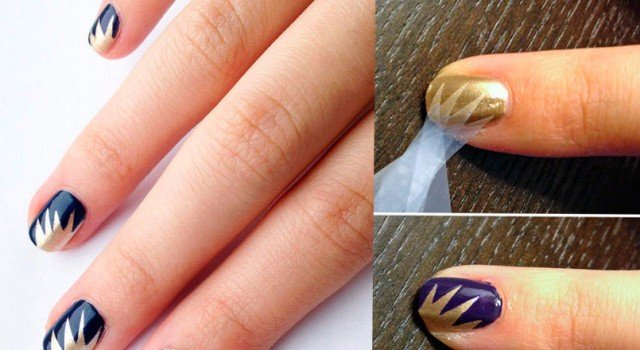 Empieza pintando tus uñas con el esmalte de color oro. Una vez que tengas la base dorada totalmente seca, (aproximadamente unos 30 minutos), inicia el corte de la cinta adhesiva tal y como te mostramos en la imagen, en forma triangular como si fuera una estrella de varias puntas.