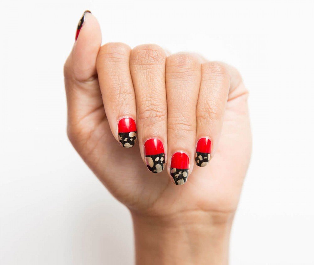 A continuación crea un patrón abstracto de piel de leopardo utilizando un esmalte dorado, los tamaños serán diferentes y será algo normal ya que la asimetría es parte de la decoración, para concluir aplica una capa de brillo esmalte de secado y listo.