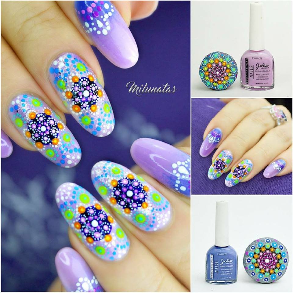 Aplica la base hidratante y procede a pintar una base con lila claro utiliza polvos para dar un toque de brillo en tonos similares al esmaltes, pinta con el pincel de detalle un circulo color violeta en el centro empezando con el pincel plano y luego con el pincel fino, comienza a realizar el patrón de puntos a medida que te alejes del centro los puntos incrementan su tamaño a medida que se alejan del centro añade pequeños puntos blancos para llenar los espacios vacíos sigue añadiendo puntos en colores vivos , no olvides cerrar los centros de los puntos con unos más pequeños en contraste, para el segundo modelo, comienza haciendo el degradado, pinta con cola blanca los alrededores para evitar las manchas, sobre la esponja cosmética añade los dos colores lila y motea, comienza elaborando un semi circulo hacia la cutículas, añade una segunda linea de puntos pinta tres puntos el central con forma de gota y son pequeños puntos laterales, sella tu diseño con brillo de apariencia de gel.
