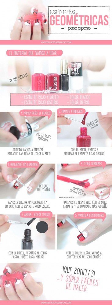 Hoy os dejo paso a paso estas uñas geométricas. No son nada complicadas, pero se necesita paciencia y algo de práctica para conseguir un buen acabado. En esta ocasión hemos usando un color claro para la base (blanco), dos tonos de rojos para hacer las figuras geométricas, y el negro para marcar un poco uno de los cuadros. Ya veréis que no cuesta mucho y obtendréis unas uñas preciosas para lucir en cualquier época del año. Aquí os dejo dónde podéis conseguir púas y pinceles.