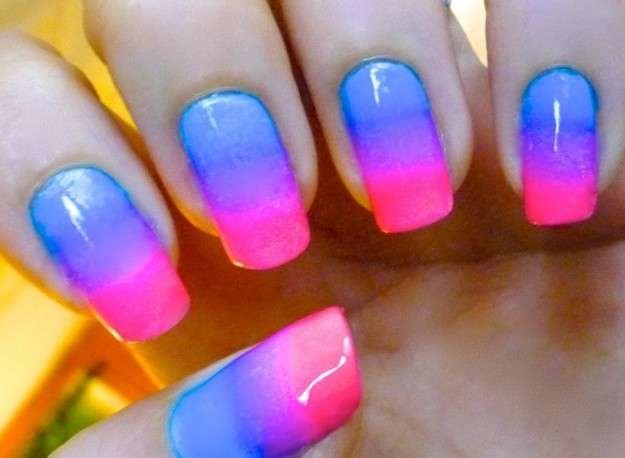 Junto a esta técnica se puede utilizar perfectamente la técnica de las uñas degradadas, que consiste en ir pasando de un color a otro sin que se note o, por el contrario, hacer fuertes contrastes con diferentes colores. Sobre el gusto no hay nada escrito, y en el terreno del Nail Art podemos hacer maravillas.